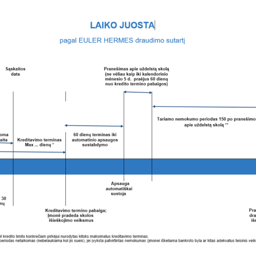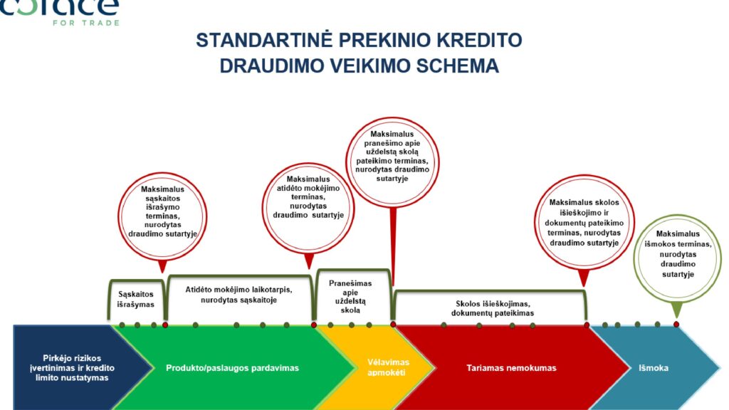 Pateiktose laiko juostų lentelėse vaizdžiai galima matyti, kokiu principu veikia prekinis kreditų draudimas. Matosi prekybos pradžia su pirkėju, atsiskaitymo laikotarpio eiga,draudimo įsijungimo fazė, bei galimos išmokos laikotarpis.