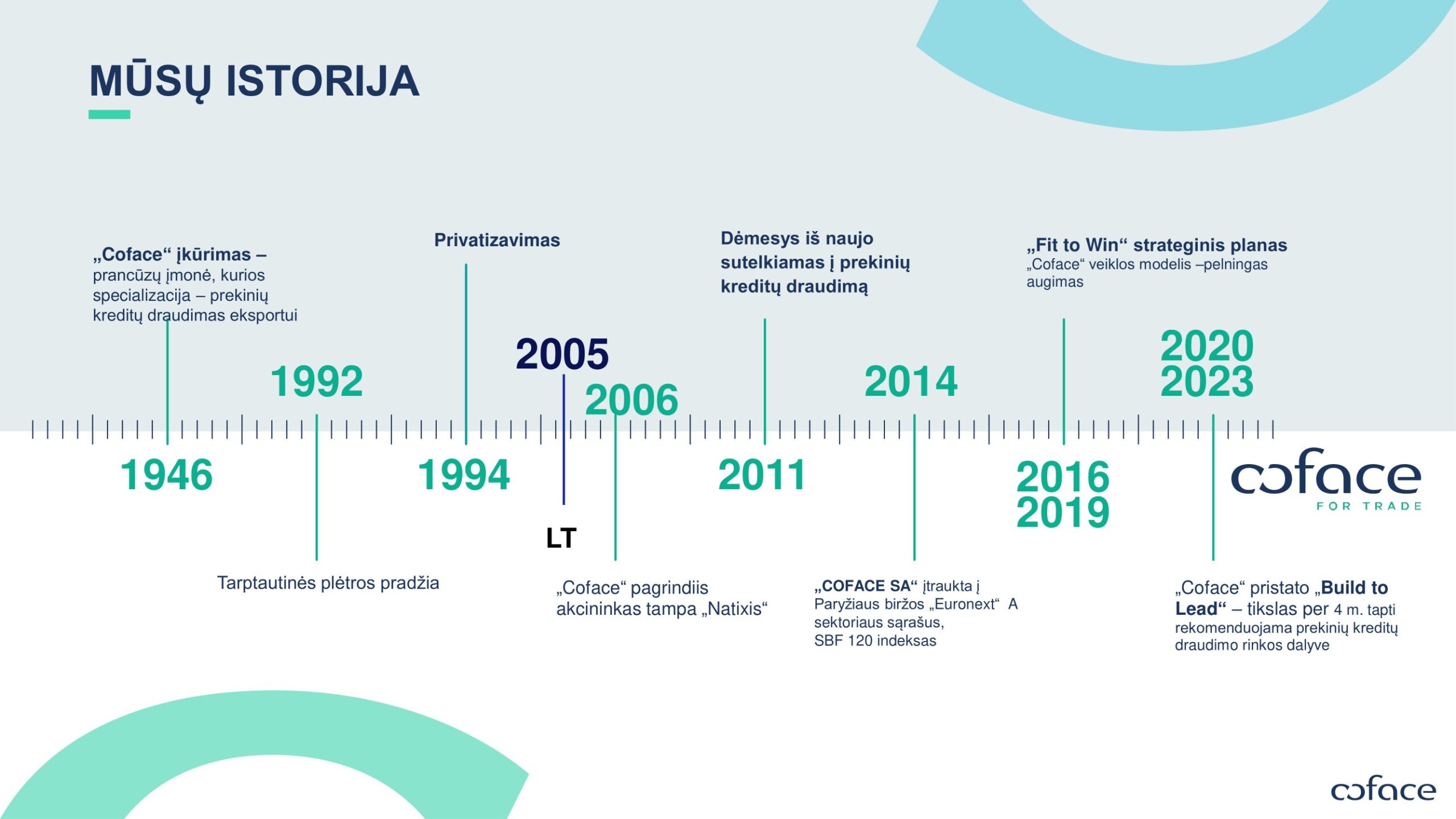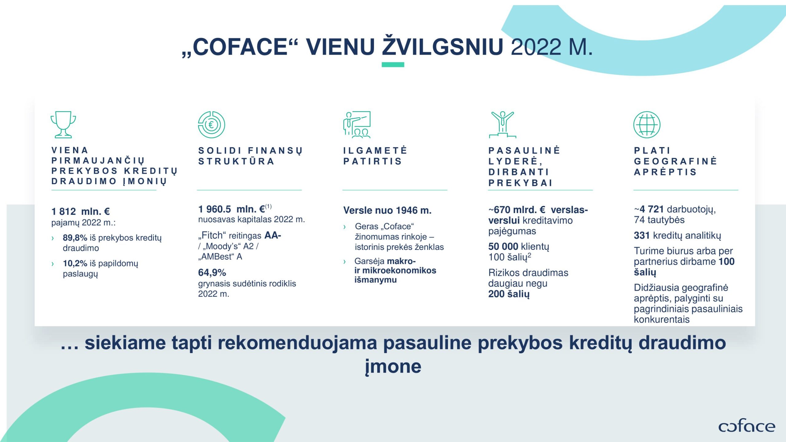 ,,Coface” – pasaulinė kreditų draudimo rinkos lyderė, pripažinta verslo rizikos valdymo srityje. Visame pasaulyje įmonėms teikiame sprendimus, apsaugančius nuo klientų finansinių įsipareigojimų nevykdymo vietinėse ir eksporto rinkose. Grupėje dirba 4400 žmonių, 98 pasaulio valstybėse tiesiogiai arba netiesiogiai užtikrinančių 40 000 sandorių su įmonėmis, veikiančiomis daugiau nei 200 šalių.