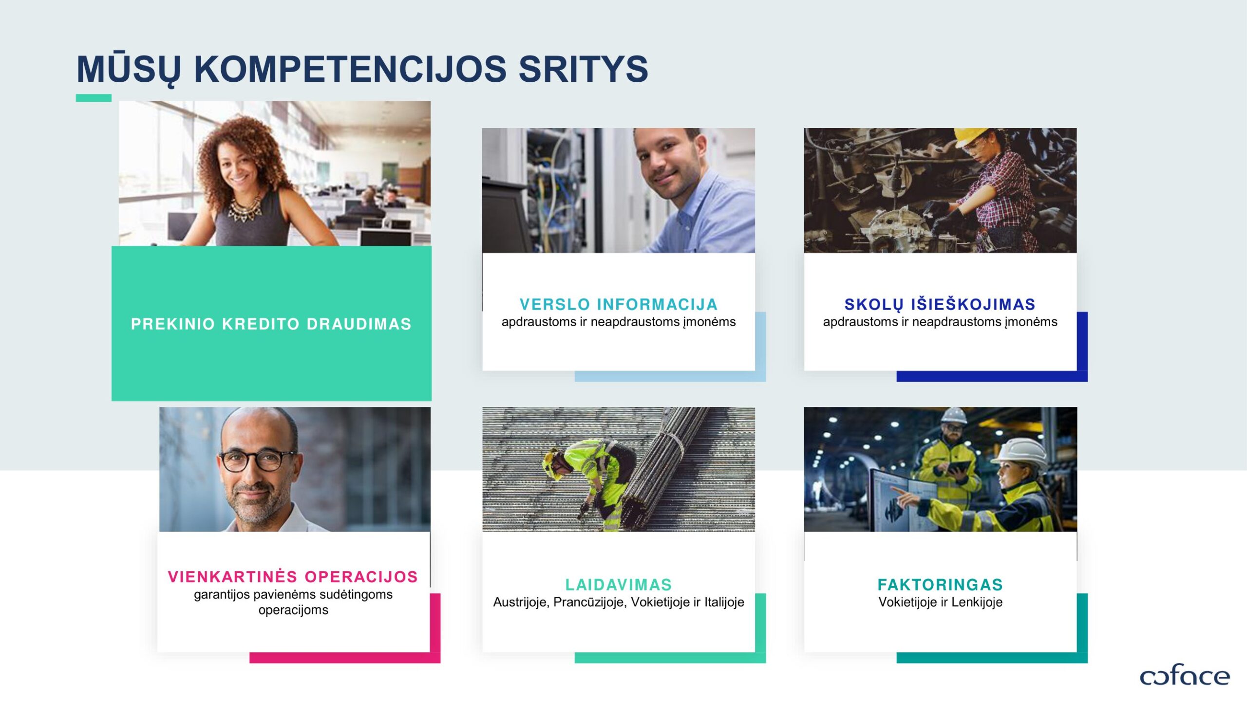 „Coface“ grupė – tai tarptautinė lyderė, viso pasaulio įmonėms siūlanti savo sprendimus, padedančius apsisaugoti nuo klientų finansinių įsipareigojimų nevykdymo tiek šalies vidaus, tiek eksporto rinkose.